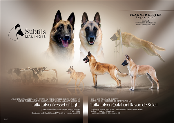 Vi förväntar oss trygga och sociala valpar med god arbetspotential och exteriör, lämpade för de flesta hundsporter.